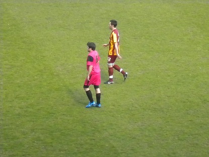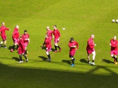 Once we were changed we made our way out onto the pitch for a warm up. There was a slight ripple of applause from the Main Stand as a few supporters had already taken their seats. We kicked some balls around in front of the Kop for a while before Jacobs gathered us together and began to conduct a gentle warm up of jogging, stretches and ball control. I recognised many of the drills from watching the warm ups at Valley Parade over the years and Jacobs stressed their importance to us, even pointing at the ‘home’ side standing with hands on hips as an example of how not to warm up! I watched how Wetherall undertook the drills as I felt it would be a good idea to follow his example! While we were playing a small game of ‘two touch’ it felt extremely surreal to be calling for ‘Wethers’ to pass me the ball!