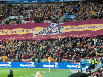 But then, the chanting in the away end re-commenced and everyone got back up their feet and started waving their flags. It took a few minutes to get on board with this positive act of defiance, but soon enough my spirits felt lifted and the pride that had been lost somewhere around quarter past four began to return. The volume grew louder and louder. The waving quicker and quicker. There seemed to be silence at the Swansea end – perhaps their own achievement in winning the cup was slightly tarnished by how straightforward the victory had proven. You would not have known which side was winning and which one was 4-0 down, simply by looking at the mood in the stands.