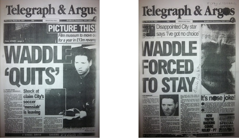 What followed made the front pages of the T&A for two consecutive days running the headlines “Waddle Quits” on 13th March followed somewhat humorously by “Waddle Forced to Stay” on 14th March.