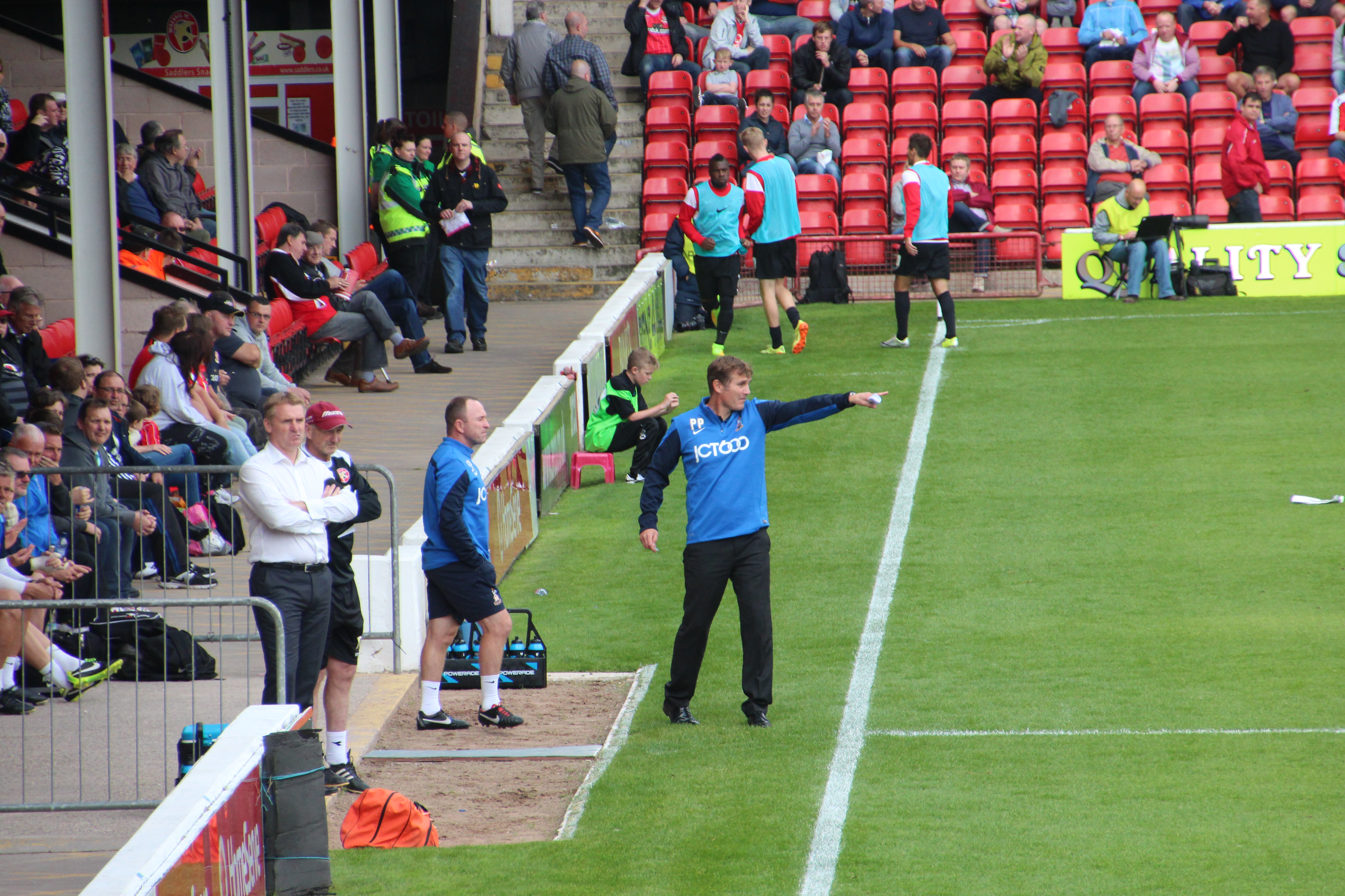 The crowd was a bit spartan in the tidy but average sized third-tier ground, with perhaps some of the Saddlers’ fans also enjoying a summer vacation. City did their part to make up the numbers, with just under a thousand in the crowd of around four and a half thousand. There were plenty of empty seats even in the away end and, therefore, no chance of a repeat of the bickering about sitting in the correct seat as there had been on the previous visit to the Banks stadium.
