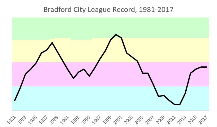 It is worth noting that if Bradford City achieve promotion in the play off final this year, they will have recorded at least seven seasons of successive improvement between 2011-18 from a starting position of 18th in the fourth division. (Admittedly it includes a couple of cases of standing still by finishing in the same position but the point is that we haven’t gone backwards.)