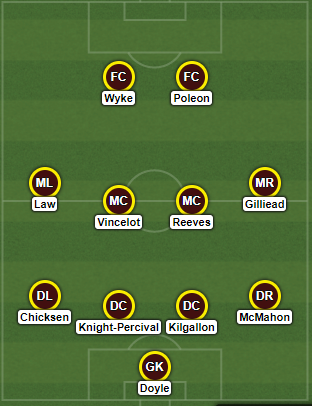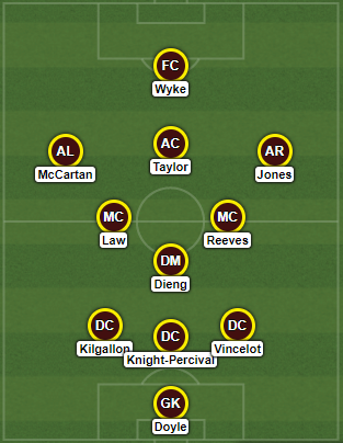 The players who will definitely start when fit are Doyle, Chicksen, NKP, Vincelot, McMahon, Reeves and Wyke. That means the other 4 places are up for grabs so that means the 3-3-3-1 is out unless McMahon plays the right side of defence role.