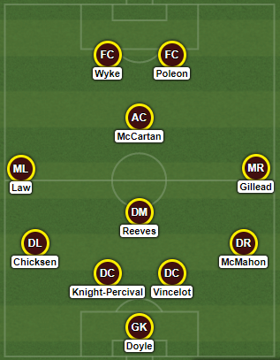 If, for whatever reason, signing another centre back doesn’t materialise, Vincelot could play there in a 4-4-2 diamond formation. Knight-Percival and Vincelot, let’s not forget, had an incredible start to last season playing at the centre of defence together. This formation would then allow McCartan to come into the team to play the attacking midfield role. However it would need Gilliead and Law to fulfil more defensive duties due to the lack of two central midfielders.