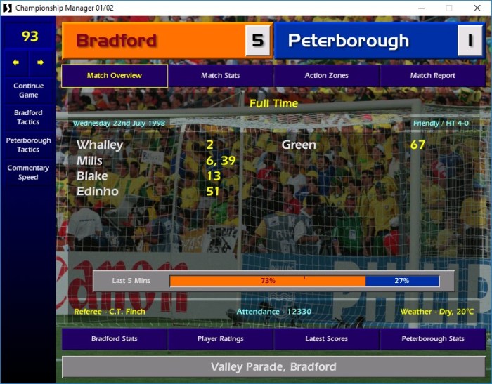 I have one pre-season friendly against Peterborough, which is mostly a scouting exercise, and I make bids for Adam Drury and Matty Etherington. The game itself is a walkover – the front 3 of Mills, Blake and Edinho run riot.