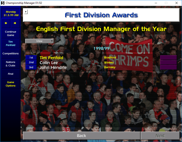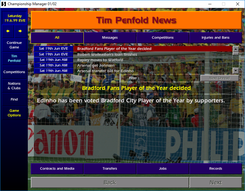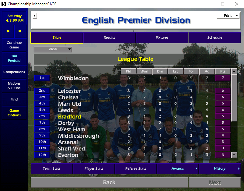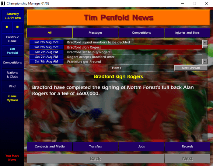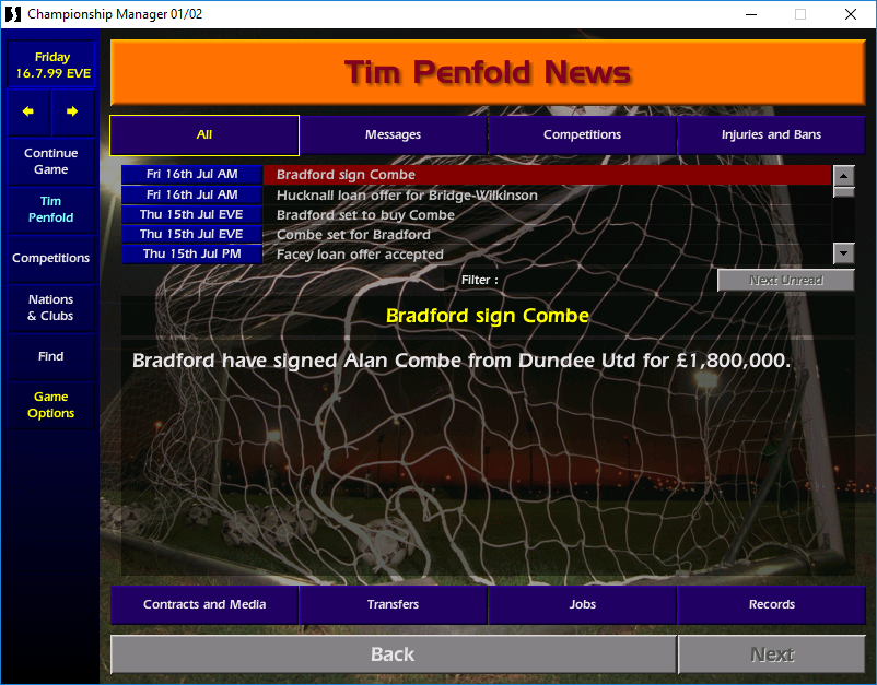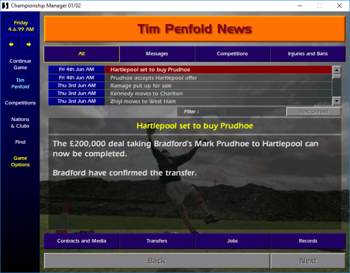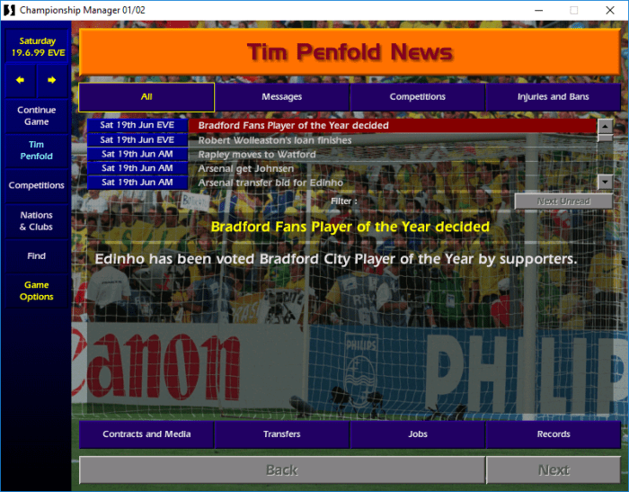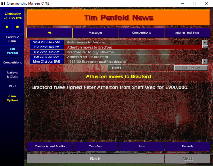 Meanwhile, my Bradford City side are preparing for life in the top flight after sweeping all before them in the First Division last season. I’m lining up transfer targets, but I’m limited to signing players and staff who have played for (or at the very least been on the books of) City in real life.