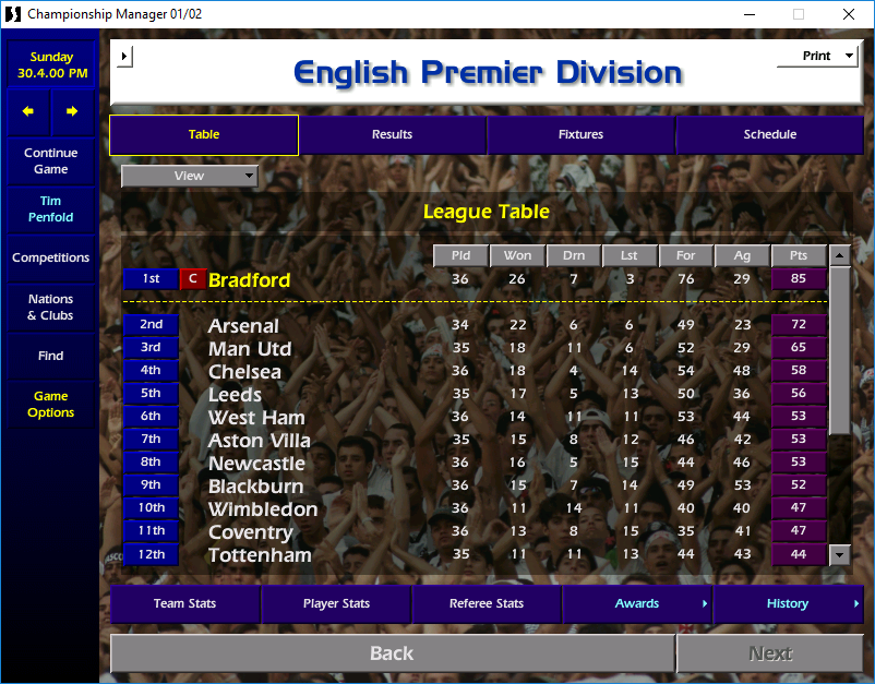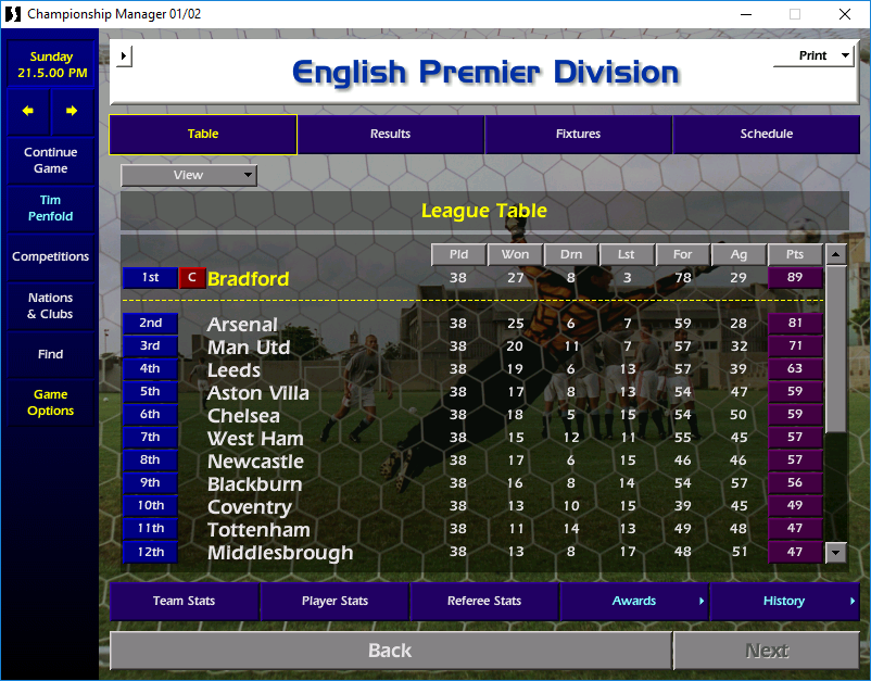 Sadly, this is where this ends. My game crashed over the summer update, and I haven’t been able to fix it, so you don’t get to see Stuart vs Barcelona. So we leave it here – Bradford City as champions, Geoffrey Richmond’s legend as chairman secured and Robbie Blake surely going on to win many more caps for England.