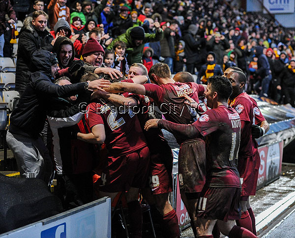 I’m sure I’m not the only one who, in the immediate aftermath of the ball going in, checks the linesman doesn’t have his flag up, or that the ref has found some reason to disallow the goal. This small hesitation can diminish that ‘hit’. That feeling of ‘Hang on a minute, we’re Bradford City, this could easily get screwed up’ is only a second or two, but is a natural reaction to a realist.