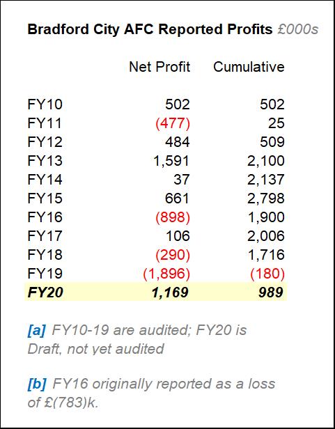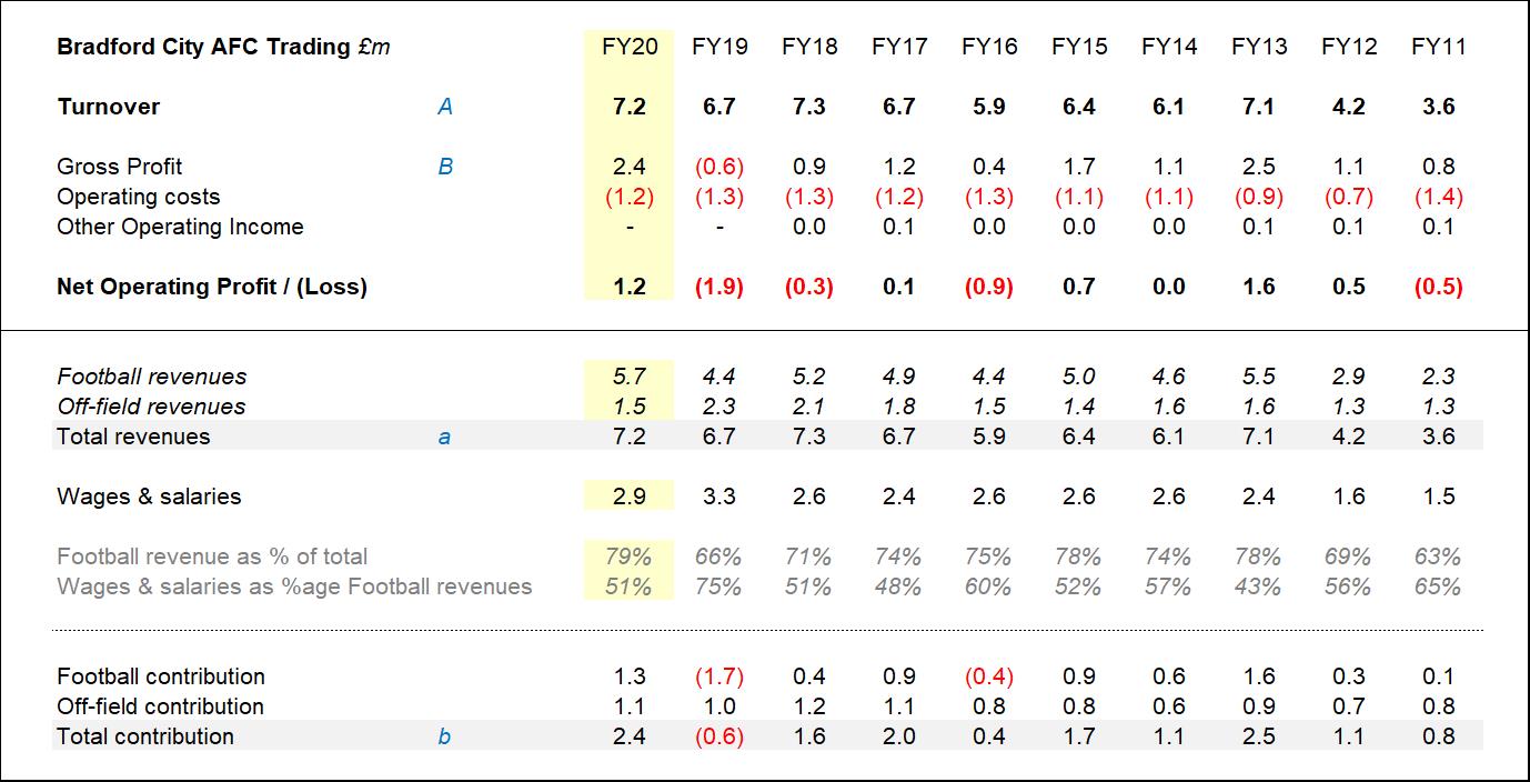 The financial record was solid and consistent although insufficient to finance overdue investment in Valley Parade – let alone a radical transformation of the club – without new monies being introduced. In the ten years to FY20 the turnover of the club was nearly doubled, albeit from a low base.