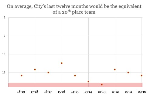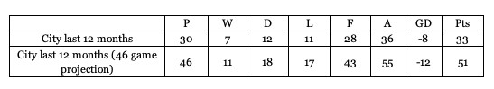Inconsistency isn’t their main issue, mind; their key problem is that they’re just not very good. In fact, over the last 12 months, since those heady days in the promotion places, they’ve been the equivalent of a 51-point team.