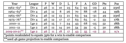 Now, with the above illustration in mind, it’s worth trying to put them in some historical context. Since the 1958 league re-organisation, City have always maintained their league status by hook or by re-election (Four! More! Years!) but whilst they have been bad frequently, they’ve seldom been this bad.