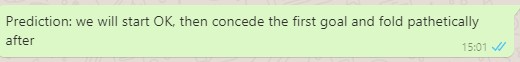I should’ve written this report in advance of the game, and saved myself the time. As the game kicked off today, I made the following prediction in the Width of a Post WhatsApp chat:
