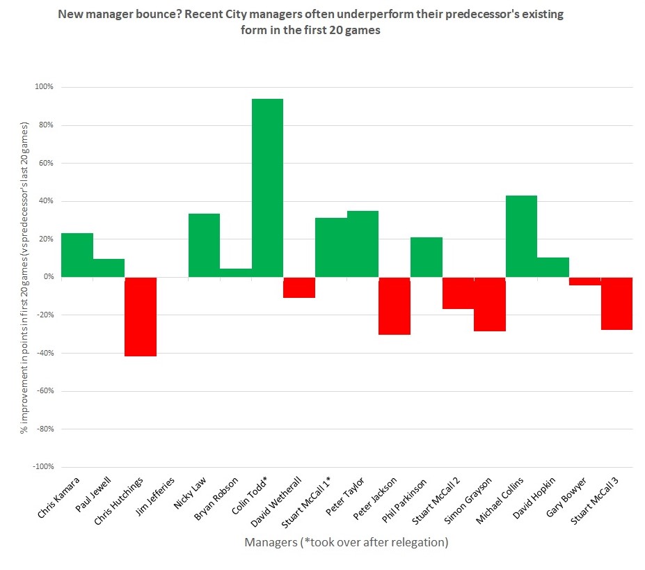 What all this means is that, over these 25 years, City were averaging 1.06 points per game before a managerial change was made (take out Parkinson’s high average, where the change to McCall was not for performance reasons, and it’s 1 point per game). In the first 20 games after a change, on average 1.1 points per game have been acquired. That’s a lot of P45s and proclamations of a new era, for an initial bounce of just 0.04 points per game.