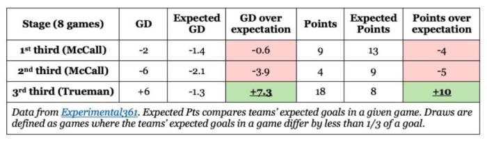 Jason, your expected goal (xG) is quite revealing. Using this analysis would likely show Trueman and Sellars results to compare closely to Bowyer’s results up to and including most of October for last season when City were in second place and “Lady Luck” was shining brightly on City. It’s worth remembering what happened when the good fortunes were reversed and the rash of injuries.