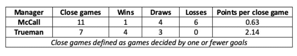 Trueman and Sellars have done magnificently well, over eight games, to already better the total points McCall managed over 16. But the margins between success and failure are thin. The following table shows the number of close City games have featured in this season (where these are no more than one goal between the sides). It is a stark difference in results, since the changes in the dugout.