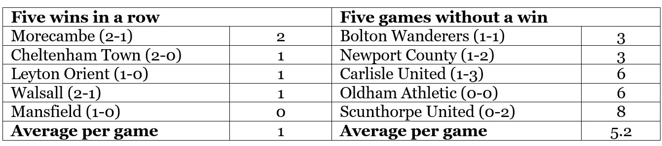 As you can see, the average number of shots on target achieved by the opposition is now five times higher. It’s got especially concerning since that evening at Newport, with Carlisle, Oldham and Scunthorpe each registering at least six attempts on goal.