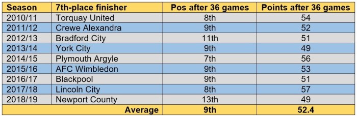The following table looks at the points total each of the 7th place League Two sides achieved over the last decade, and the amount of points the team immediately below them collected. Given the 2019/20 season was curtailed, we’ve not included the points total of last season’s 7th place finisher, Northampton.