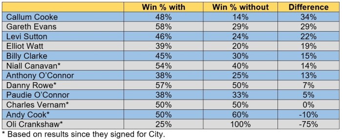 And that’s why injuries to anyone – not just Cooke – could really make or break their season. The following table shows the most influential outfield City players this season, in terms of the club’s win percentage with and without them in the starting XI.