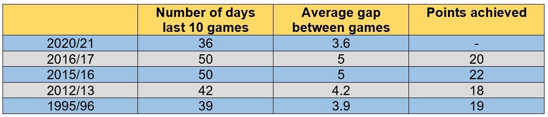 The following table shows the number of days left between City’s 37th and 46th league fixtures this season, and how it compares to the club’s last four successful play off charges.