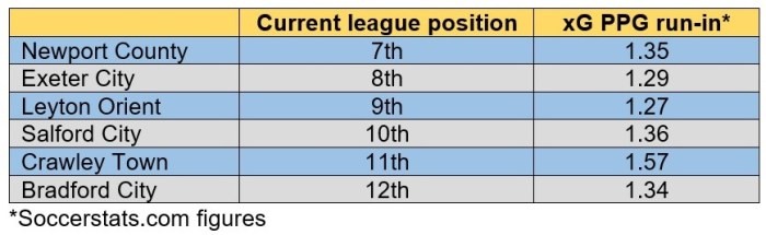 What this shows is that Crawley appear to have the toughest run-in of the 7th-place contenders. And Leyton Orient have the easiest. City are somewhere in the middle, and you can choose whether to take a glass half full or half empty outlook to their remaining fixtures. They’ve either got the third easiest run-in, or the fourth toughest.