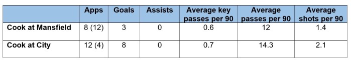 Interestingly Cook’s stats for City, compared to Mansfield, are marginally better. He’s scored more goals of course, plus his passing average is better, and he’s having 33% more shots on goal. His key passes and assists – which were already very low at Mansfield – are no different. And that’s fine, because Trueman and Sellars aren’t expecting Cook to create chances.