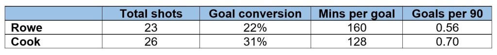 This shows that the pair have had almost the same amount of shots on goal, but Cook is more successful at turning these attempts into goals.