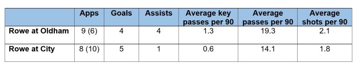 Rowe has scored more league goals so far at City, but his influence on his team’s build-up play has notably decreased. He has one assist so far, compared to four with Oldham. His key pass average (a pass that leads to a shot at goal) is less than half what it was, and his average number of passes and shots on goals are down.