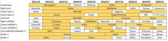 The greater amount of white boxes, over recent years, is testament to the large amount of season on season change in certain positions, not least up front and certain midfield areas. Whereas the consistent spine of a Bradford City over the successful years of 2012-17 is clear.
