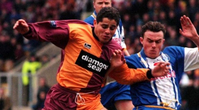 A fee of £250k was agreed for Edinho’s services, and he was presented to the Valley Parade crowd before a home game against Huddersfield Town. As introductions to English football go, it was blunt. Within 10 minutes of the game starting, Gordon Watson – slated to be Edinho’s new strike partner – was stretchered off with a broken leg after a horrific challenge from Town defender Kevin Gray.