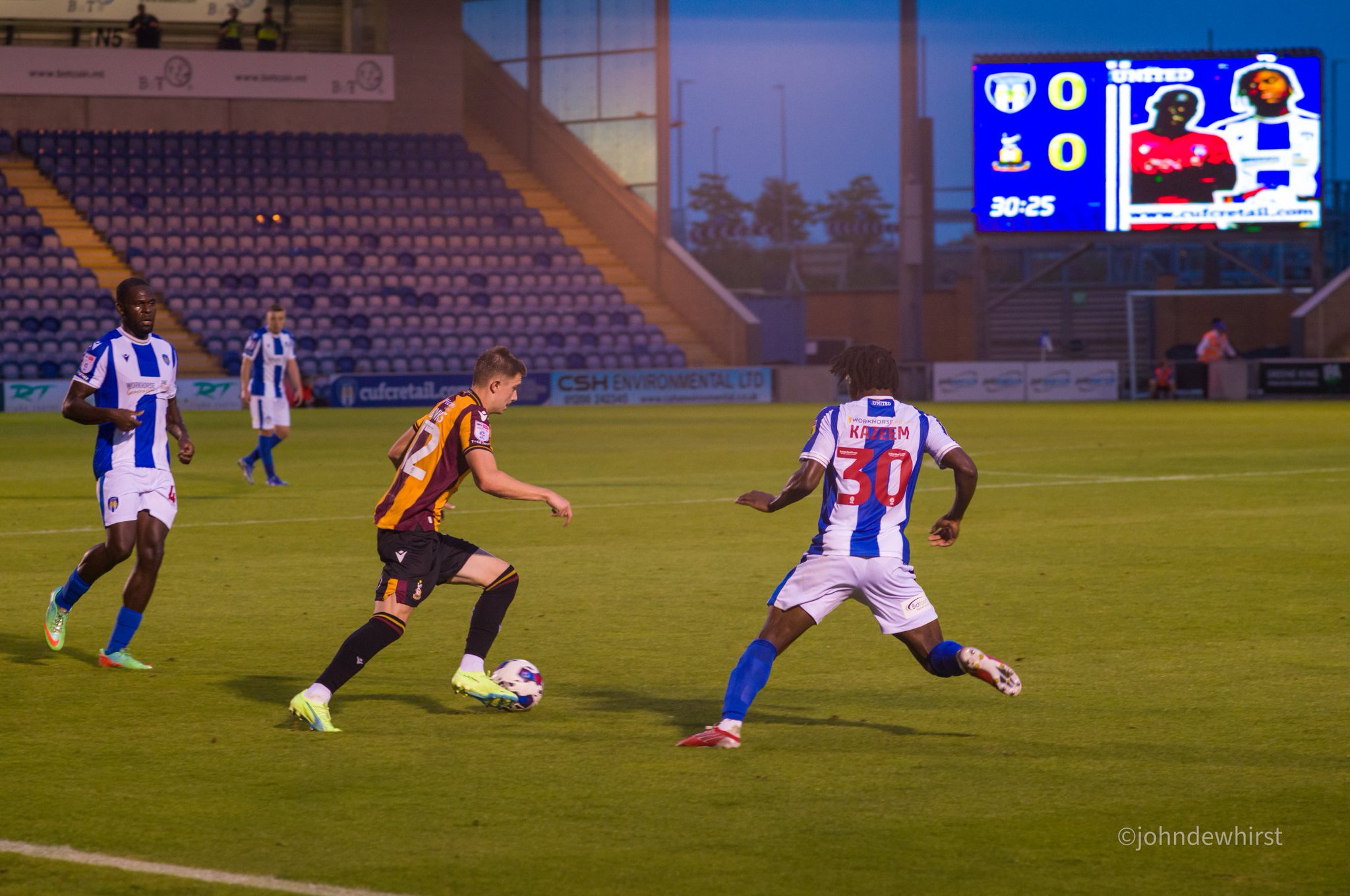 There was no pressure applied to Romoney Crichlow, Matty Platt, Richie Smallwood and Alex Gilliead as they confidently knocked the ball around, but with heavy congestion of blue and white shirts between them and Sam Hornby’s goal, actually making possession count proved a problem here – just as it had against Doncaster and Barrow. Marley Marshall-Miranda spent the game following Harry Chapman everywhere he went. Al-Amin Kazeem stood up well to the threat of Scott Banks.