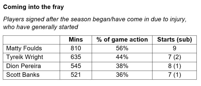 The next group we can call “Coming into the fray”. These are players who have either joined after the season began (Tyreik Wright, Dion Pereira and Scott Banks), or Matty Foulds, who came in for the injured Liam Ridehalgh in September and hasn’t looked back, making the left back position his own.