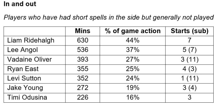 Lee Angol, Vadaine Oliver and Ryan East did start the season in the team but have lost their places. They can no longer be certain of even a spot on the bench. Sutton has started just once in the league and seems a player getting left behind, as do summer arrivals Jake Young and Timi Odusina. Young has not even been on the bench in recent games, despite looking as potent as the other forwards.