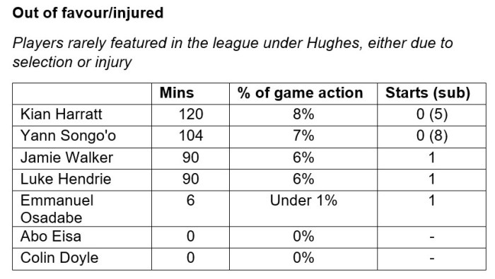 And that leaves the final group “Out of favour/injured”. We can’t judge Jamie Walker and Emmanuel Osadebe (injured since the opening weekend), and their eventual return will certainly present some big selection dilemmas. Abo Eisa has continued to have injury problems, and it’s not clear what Hughes thinks of a player he inherited but has barely seen.
