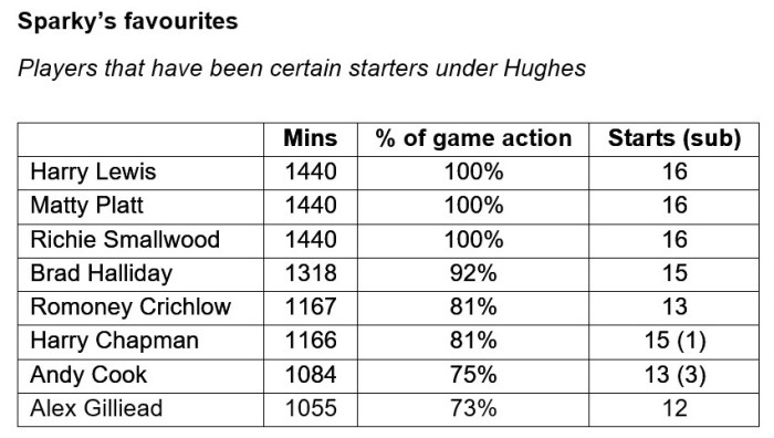 First up are what we’ll call “Sparky’s favourites”. Eight members of the squad have been pretty much nailed on certain starters since the opening game. Harry Lewis, Matty Platt and Richie Smallwood are League Two ever-presents. Brad Halliday is just behind, only missing one game due to a suspension. You’ve got Romoney Crichlow – left out for three games through injury/a slight dip in form – but otherwise a firm fixture. And finally, there’s Harry Chapman (sub on the opening day and has since started every game), Andy Cook (started every game since the end of August) and Alex Gilliead. The latter has missed four games, either through injury or when he became a father.