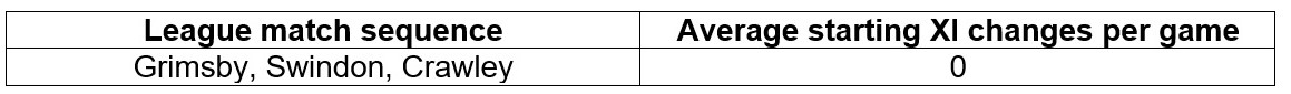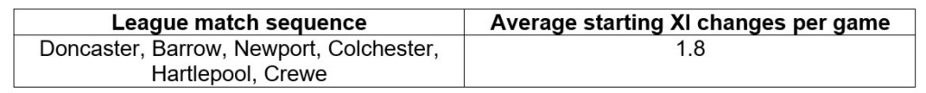Firstly, let’s look at the first six league games that were played before the Papa John’s Trophy campaign began. Over this period, Hughes made an average of 1.8 changes to his starting line up. He was certainly open to change, and in the midweek defeat to Colchester – for example – rested a couple of players. The defeat that night might have dissuaded him from rotating as a strategy.