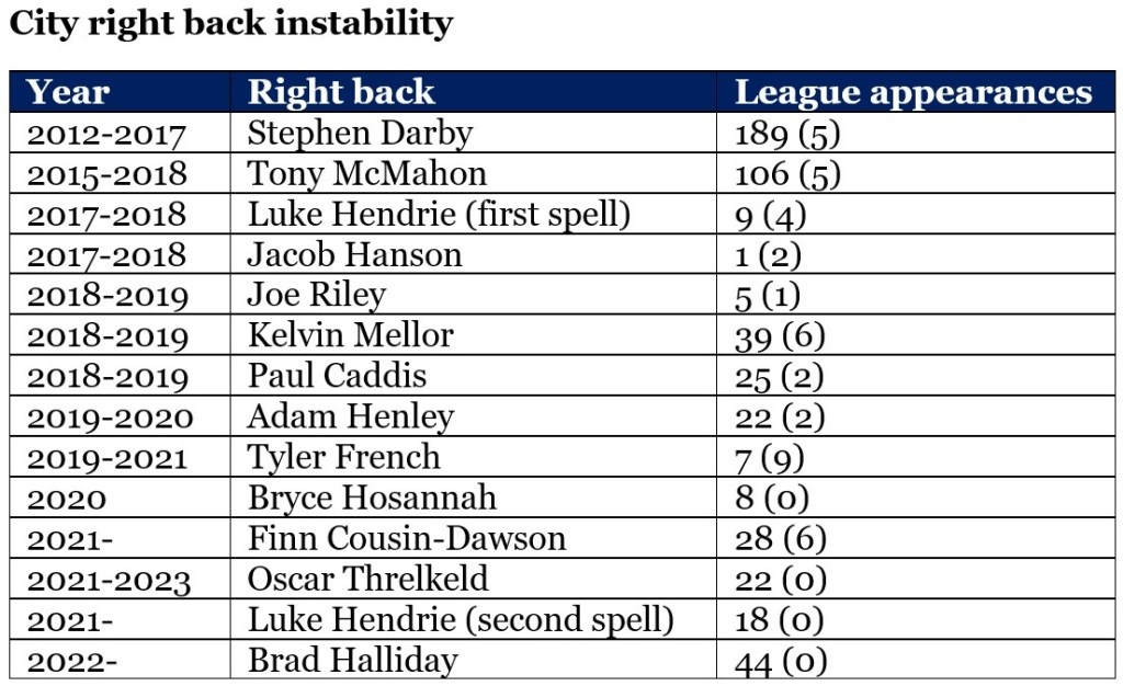 Throw in a bunch of others who filled at right back over these years too – Thomas Isherwood, Dylan Mottley-Henry and Timothée Dieng spring to mind – and this has been a true problem spot for various City managers. Outside of Caddis, you could argue our most successful right back between 2017-2022 was an out-of-position Anthony O’Connor.