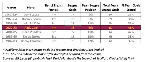 So rather than waste all our time by writing 1,000 words justifying why Andy Cook has been the best City player this season, I’m going to set myself a more ambitious goal, picking up on a thread left by Jason earlier in the season. I think Andy Cook might have just completed the most impressive attacking season in the history of Bradford City.