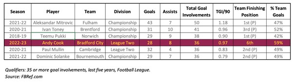 Of anyone in the Football League with a comparable season over the past five years, Andy Cook has had the highest degree of difficulty leading this flawed City team. To do what he did in this context is – arguably – the most impressive personal season for a forward in the Football League over the past five years.