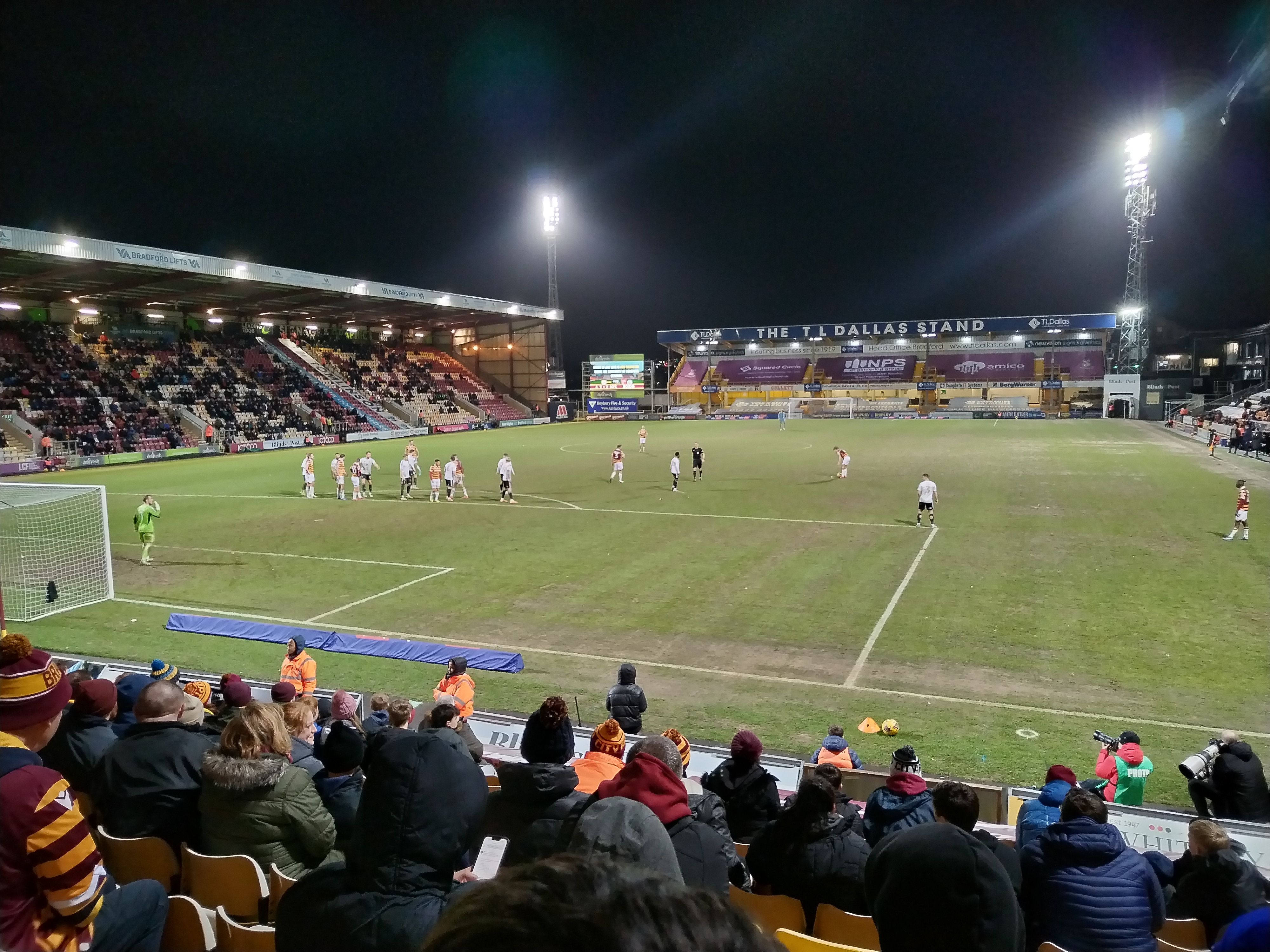 Boring is also the best word to describe the football from Graham Alexander of late. It was a windy night, a dreadful pitch – no one rocked up expecting to see Bradford City tiki-taka. But were the conditions really enough of a reason for such a directionless and ugly approach from the home side? Necks began to ache from 90+ minutes of watching the ball launched aimlessly in the air, high and forward. No subtly, no finesse. It was incredibly dull and flat.