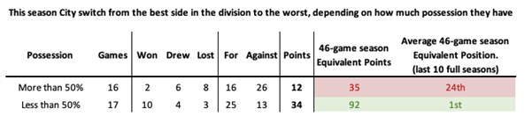Remarkably – and this stat is so neat, I didn’t trust it, and went back to re-do the maths, but I think this is right – from the start of this season, when City have more than 50% possession (half their games), they are the worst side in the division. When City have less than 50% possession (the other half of their games), they are the best side in the division.