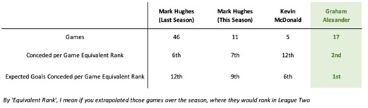Since Alexander took over, City have been essentially the best defence in the division. They’ve conceded 18 goals in 17 league games, and let’s not forget that the first six of those goals came in his first game and a half, playing four at the back.