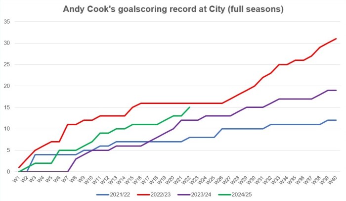 As the graph below shows, Cook was just about on track to have his best season yet in a City shirt. The graph charts the number of goals he has scored over the course of each of his full seasons at the club. The green line (2024/25 season) shows that after his Port Vale brace, he was just one short of total he had at this stage of his immense 31-goal haul of 2022/23. And given at this stage of that campaign, Mark Hughes rested him up for a month, slowing his goal progress, there was every reason to believe Cook was about to move above 2022/23 (the red line). At least there was before he went down in a heap at Barrow.