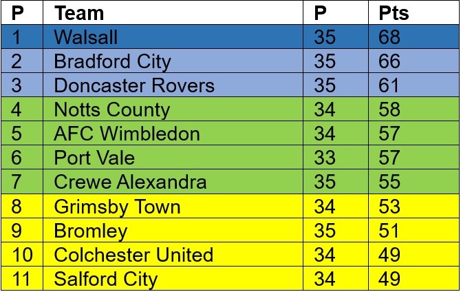 The penultimate weekend of fixtures is definitely tasty. As City and Doncaster lock horns, there’s a big clash between AFC Wimbledon and Port Vale that could decide an awful lot. Walsall are at home to Accrington and Notts County go to Harrogate.