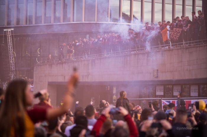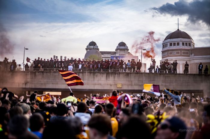 Eventually, we’re told the open top buses have arrived. You can’t actually see them from inside the bowels of the mirror pool. But they’d made their way from Valley Parade, up Manningham Lane, along Manor Row, past Upper Piccadilly and eventually down Goodwin Street. Travelling slowly and carefully past the masses of delighted fans.