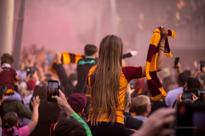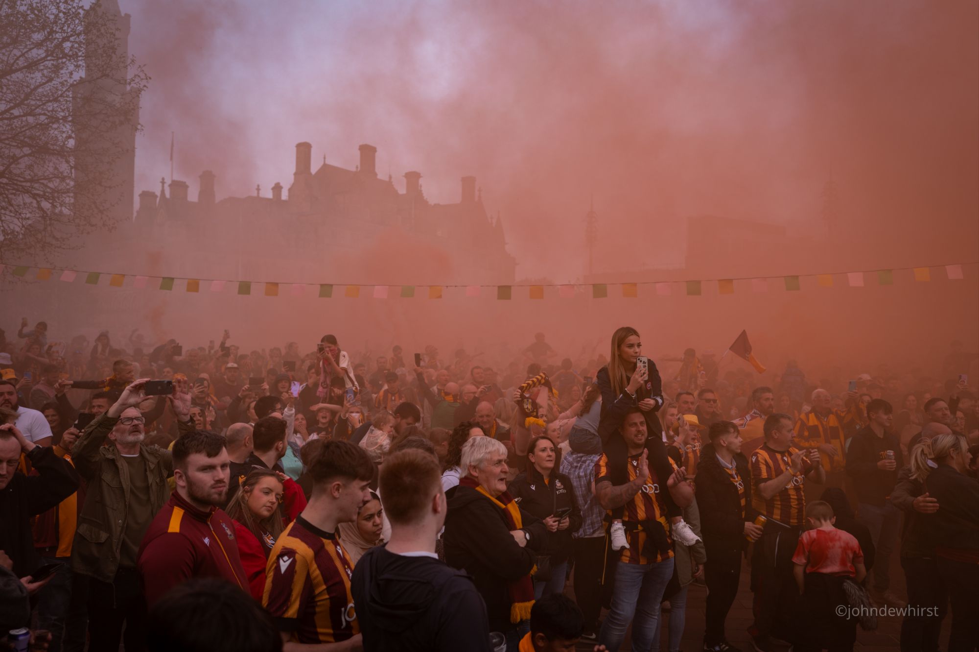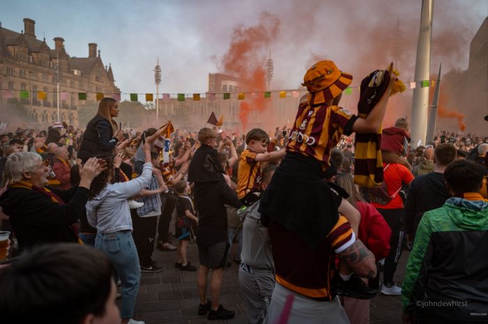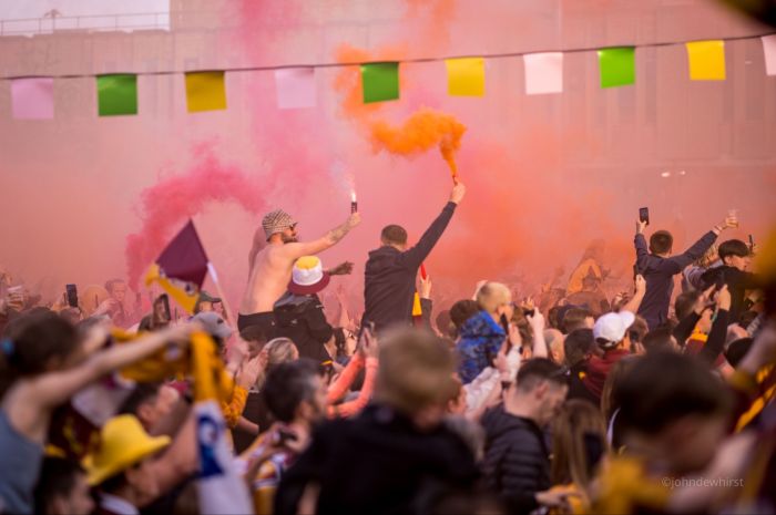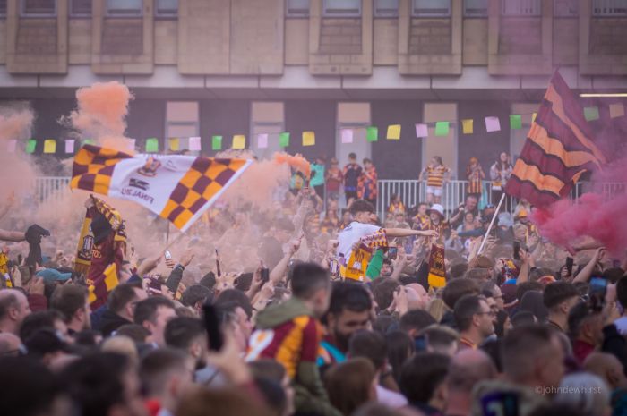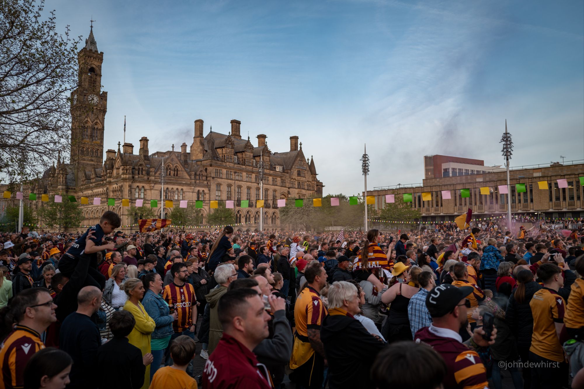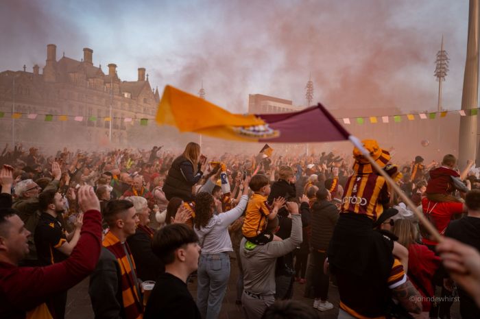 There’s a dog decked out in a Bradford City shirt. There’s a guy in a flat cap and a 2006/07 relegation top holding a can of beer in the air, embarking on some of the greatest dad dancing you will ever see. There are flares – so many flares, with the colours fusing together to create a claret and amber cloud. There’s a Bradford City flag nearby city hall, fluttering majestically in the breeze.