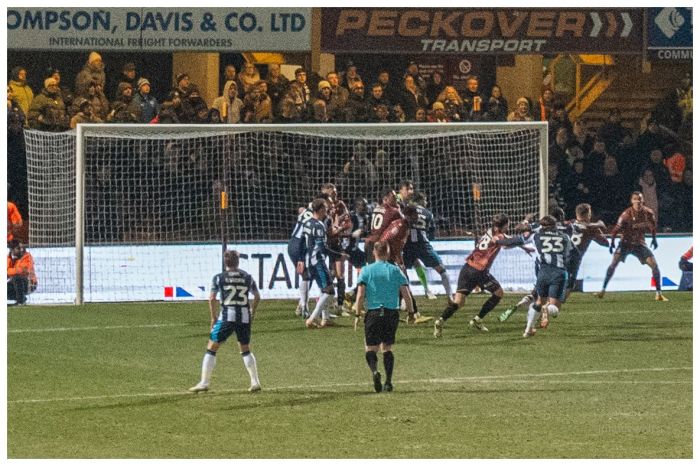 Three minutes into the second half, Antoni Sarcevic seized on Lewis Bate’s hesitancy in the box by nicking the ball from the County defender. The ball bounced up perfectly, and Sarcevic struck a powerful left foot volley that flew into the back of the net.