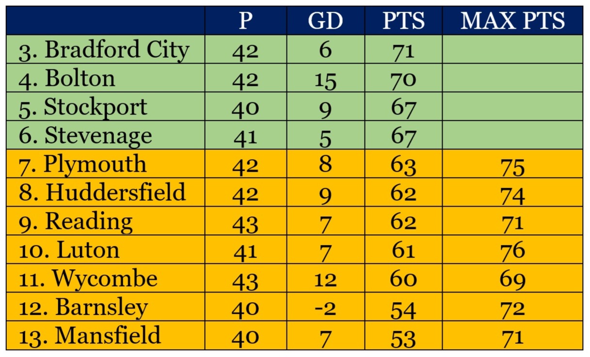 Including Barnsley and Mansfield, six of the seven teams below the play-off line could mathematically overtake the Bantams (Wycombe are the only exception). But those maximum points are useful to consider. 76 is the most any of the chasers can reach, meaning 77 points would absolutely guarantee City a play-off finish. So two more wins definitely seals it.