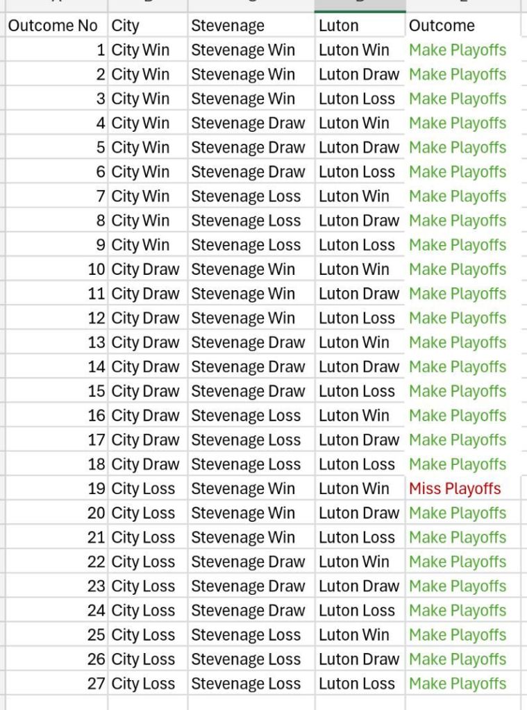 During this episode, Alex Scott talks about building a spreadsheet of the 27 possible outcomes. Here it is in all it’s glory!